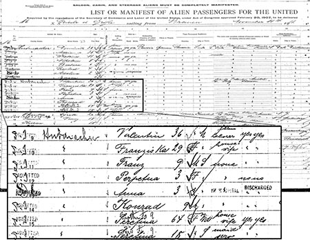 After hearing this, Valentine (age 36) decided it was time to get out of Russia. So he took his Francis (29), children Franz (9) Perpentua (3), Anna (3), and Konrad (9 months) and mother Serefina (64), for his father passed away in 1910, and left for the United States of America. They landed at Ellis Island, New York, November 24, 1911.