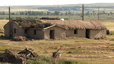 The kitchen was added to the west shortly after the original house was built. The walls were covered in oilcloth and painted. This technique prevented the mud plaster from flaking off in the cooking area and provided a scrubbable surface.